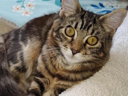 Polly is 5 months old and a beautiful semi long haired tabby. She is super friendly, although a little nervous around children (she doesn’t like the noise!) and initially shy with strangers. Polly is a ball of energy, playful, inquisitive, and into everything. Polly also enjoys quiet time snuggled up on your lap, or laying next to you with her head on your lap, rolling around purring.
