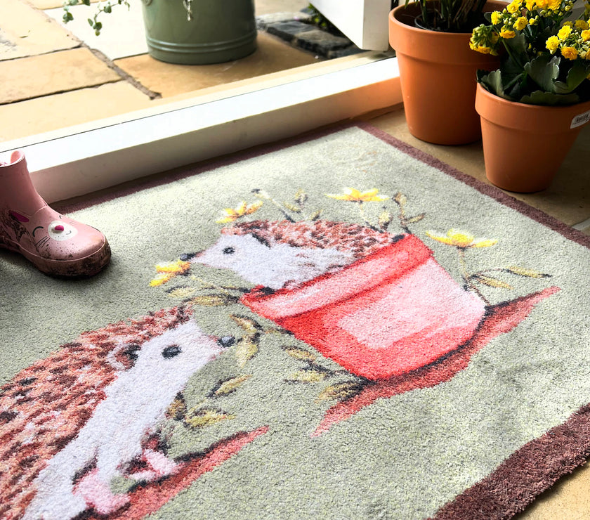 Hug Rug offers the most eco-friendly, washable doormats available. Ideal for putting by your doorway to trap dirt and protect your floors, whilst adding some style and colour to your home. The Hedgehog Friends design has a sage green background with a brown border and features two hand painted hedgehogs and a terracotta pot with yellow flowers.
